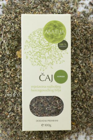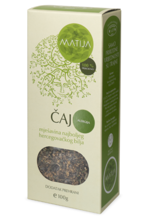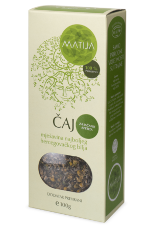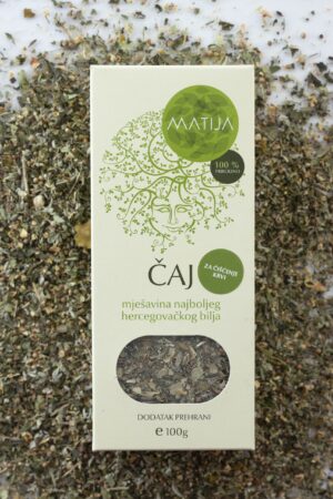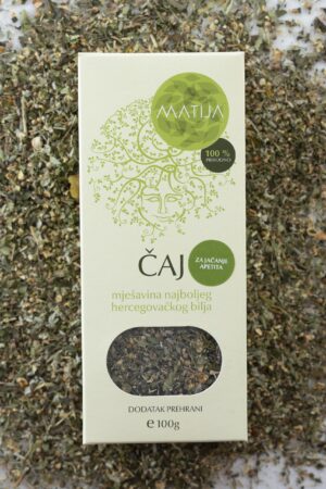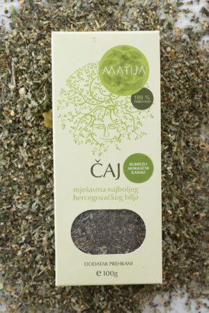 Biljni čaj za dobar san sačinjen je od mješavine hercegovačkog bilja koja ima umirujuća svojstva. Ovaj čaj najbolje je konzumirati prije spavanja kako bi san bio lakši i slađi, zbog čega je i dobio svoj naziv. Bez brige, čaj se može konzumirati i tijekom dana ako se nađete u stresnoj situaciji ili ako jednostavno želite umirujuću šalicu čaja. Način primjene: U 1/2 hladne vode staviti 5 čajnih žlica mješavine. Vodu s mješavinom prokuhati te poklopiti 1 sat. Čaj je poželjno piti što topliji kako bi umirujuća svojstva bila što bolja. Konzumiranje ovog čaja dozvoljeno je više puta dnevno, no svoja svojstva dovoljno dobro pokazuje i konzumiranje jednom dnevno točno prije spavanja. Čaj možete zasladiti i medom. Tajna koju ćemo Vam otkriti je: u šoljicu čaja ukapati 10 do 15 SMIREX KAPI, kako bi Vaš san bio jos čvršći. Sastav: menta, kamilica, list melise, lavanda, kadulja, čubar, lipa.